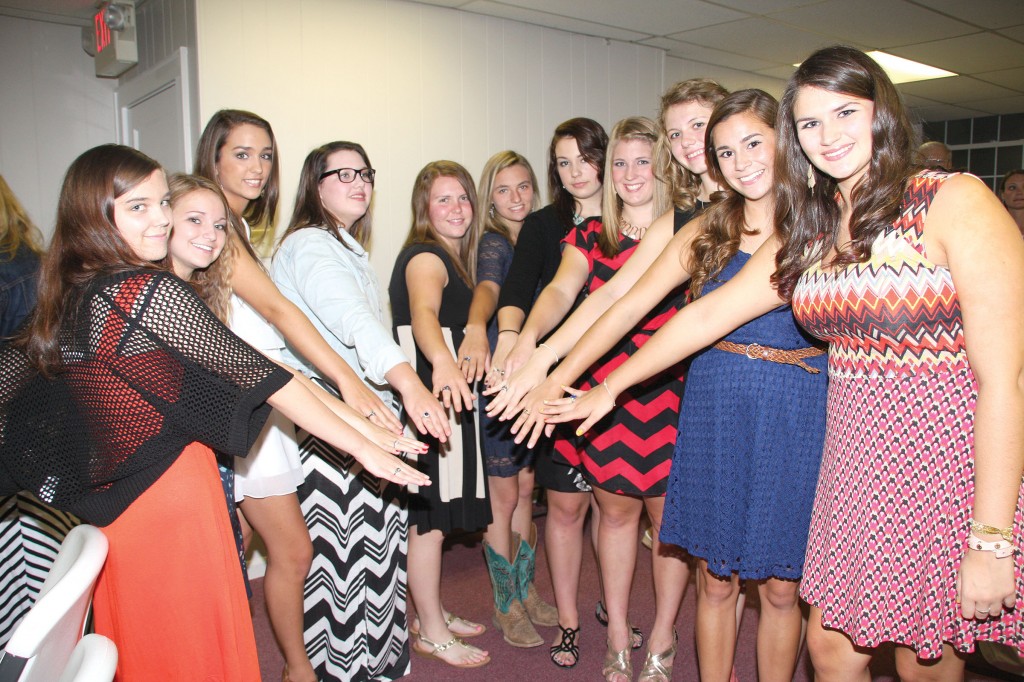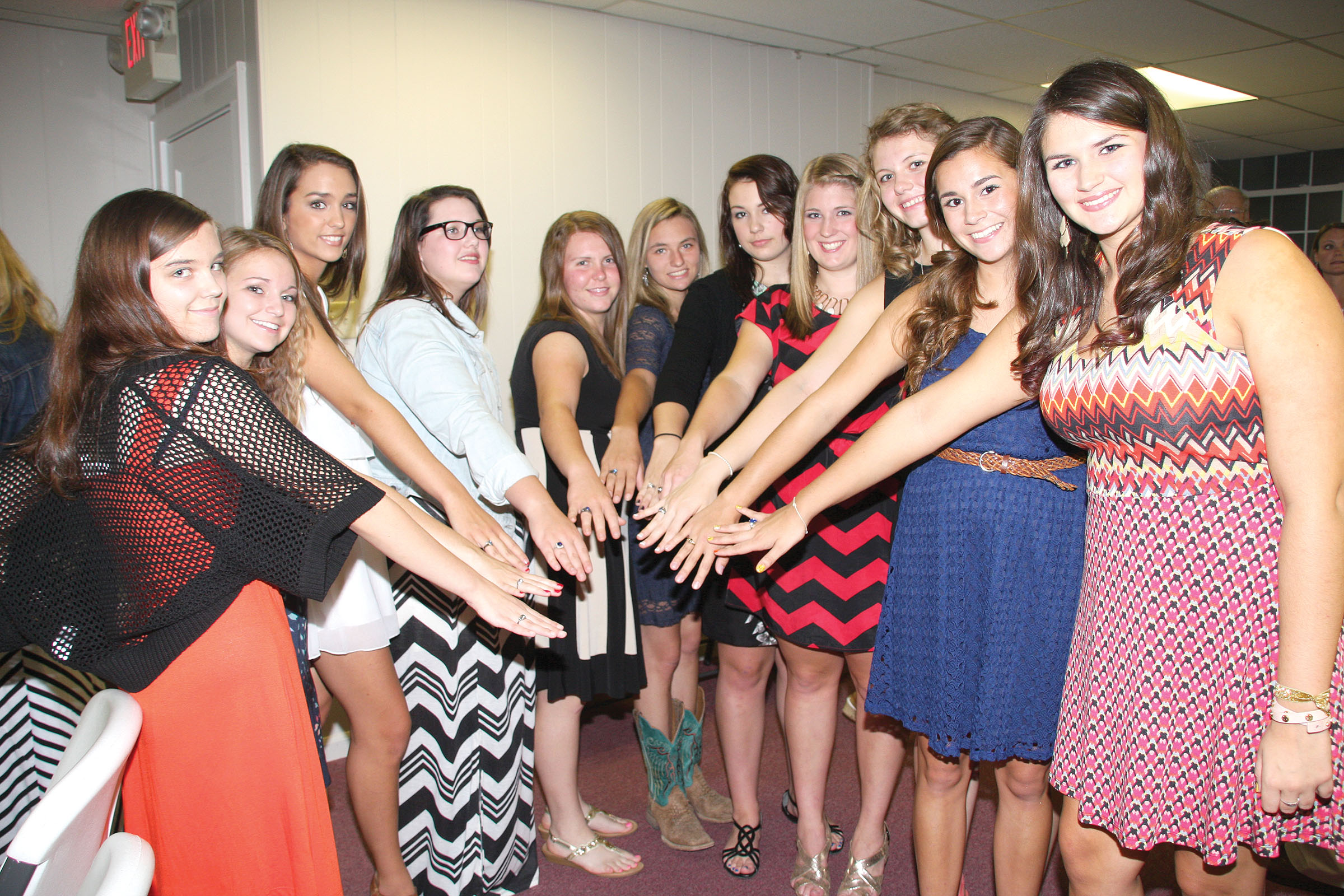 Jessica McCullar, Hannah Silvia, Madison Spang, Catherine Mann, Erin Johnson, Creighton Ellison, Emily Brigman, Cassidy Branham, Jessie Stidham, Jordan Parris and Cassie Rae Cantrell, members of the Richard Winn Academy Class of 2015, circle up for a photo opportunity to show off their new “hand candy” in the form of high school class rings. Last week, all 20 members of the Richard Winn Academy Class of 2015 received their high school rings during a ceremony in the Bethel ARP Church sanctuary as parents, siblings and special family members presented the juniors with their class rings.