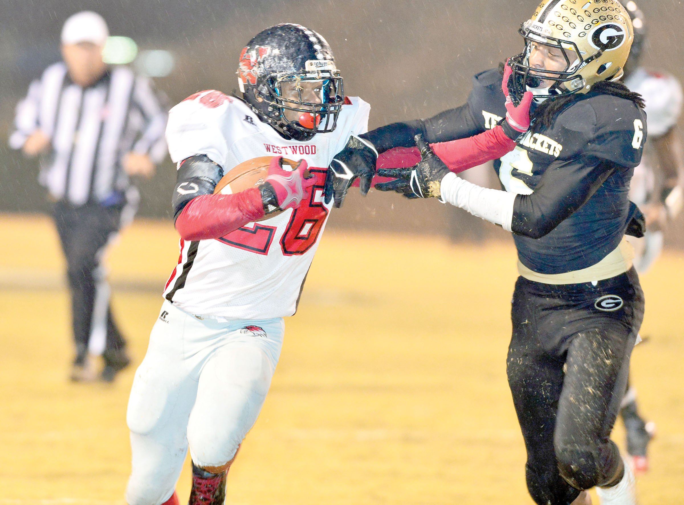 Westwood’s Christian Brown gives Greer’s Marquis Lyles a taste of the stiff-arm during Friday night’s playoff struggle. (Photo/Ross Burton)