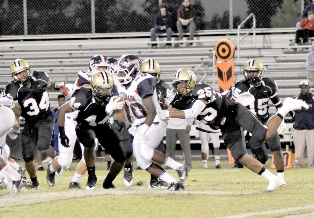 Fairfield Central’s Davon Pearson takes Cheraw’s Randall Watson by the shirt tail as Dustin Padgett (44) swoops in to finish off the Braves running back during the Sept. 27 meeting between these two Upper State finalists. (Photo/DeAnna Robinson)