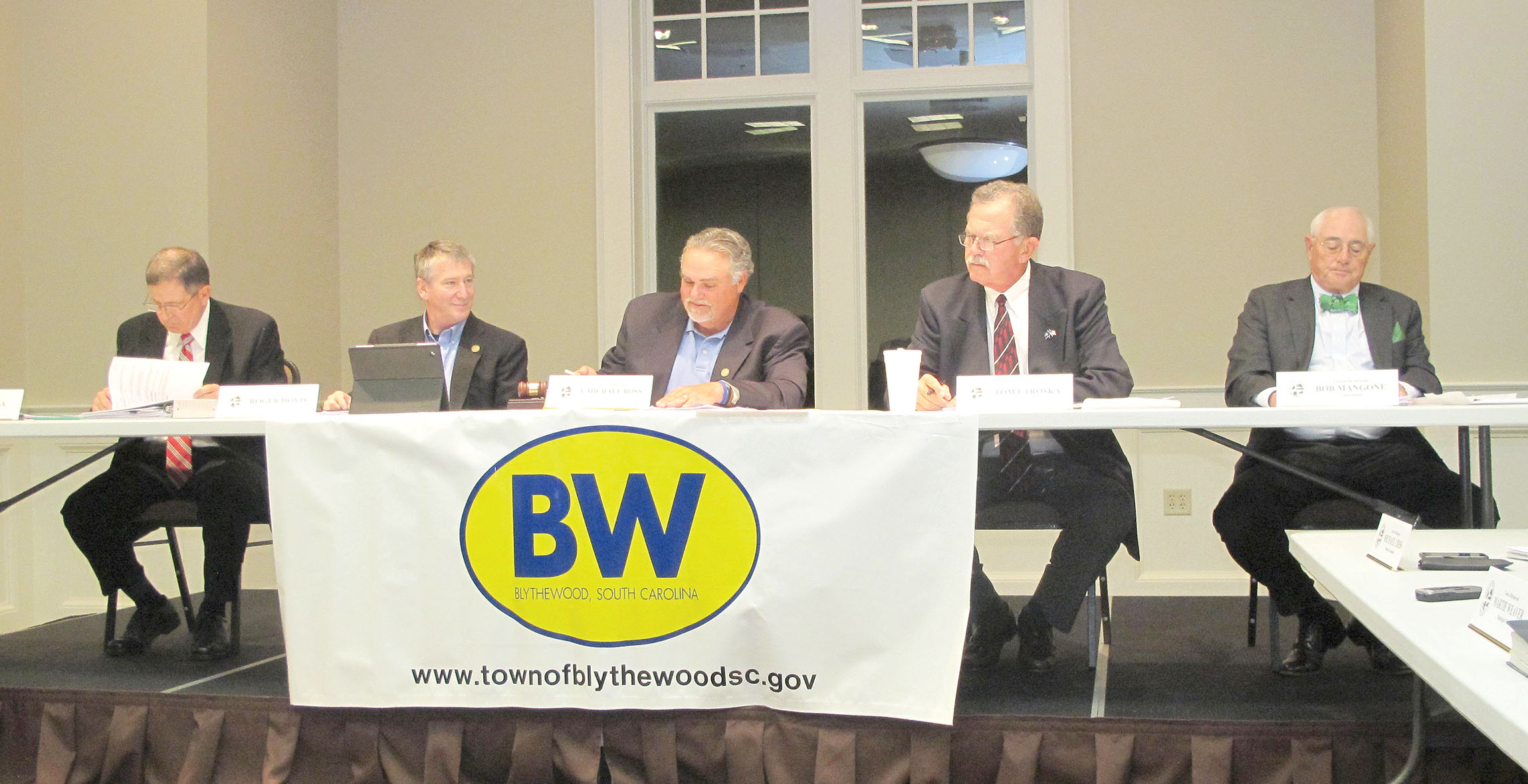 Blythewood’s new Town Council, Bob Massa, Roger Hovis, Mayor J. Michael Ross, Tom Utroska and Bob Mangone, sat for their first meeting Monday night.