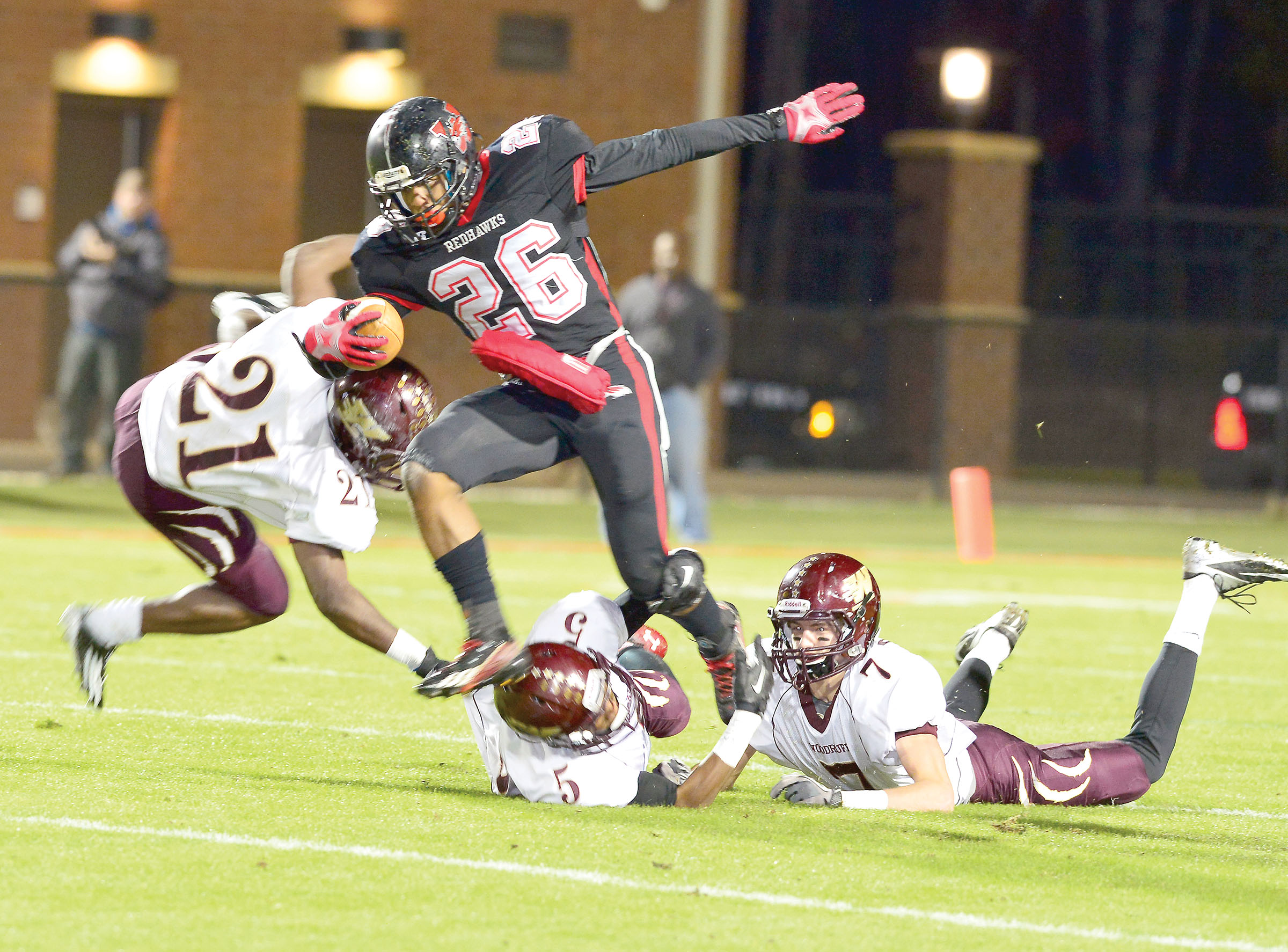On the next Redhawk possession, after Gist fumbled on a keeper, Brown made a big play by running the ball 38 yards close to the Woodruff red zone. That was Brown’s last play of the game, as he was replaced by Miquelle Canady. Canady filled Brown’s shoes admirably, running the ball 33 yards in three plays. The last play was a three-yard carry across the goal line. Howard again was successful and perfect on the night.