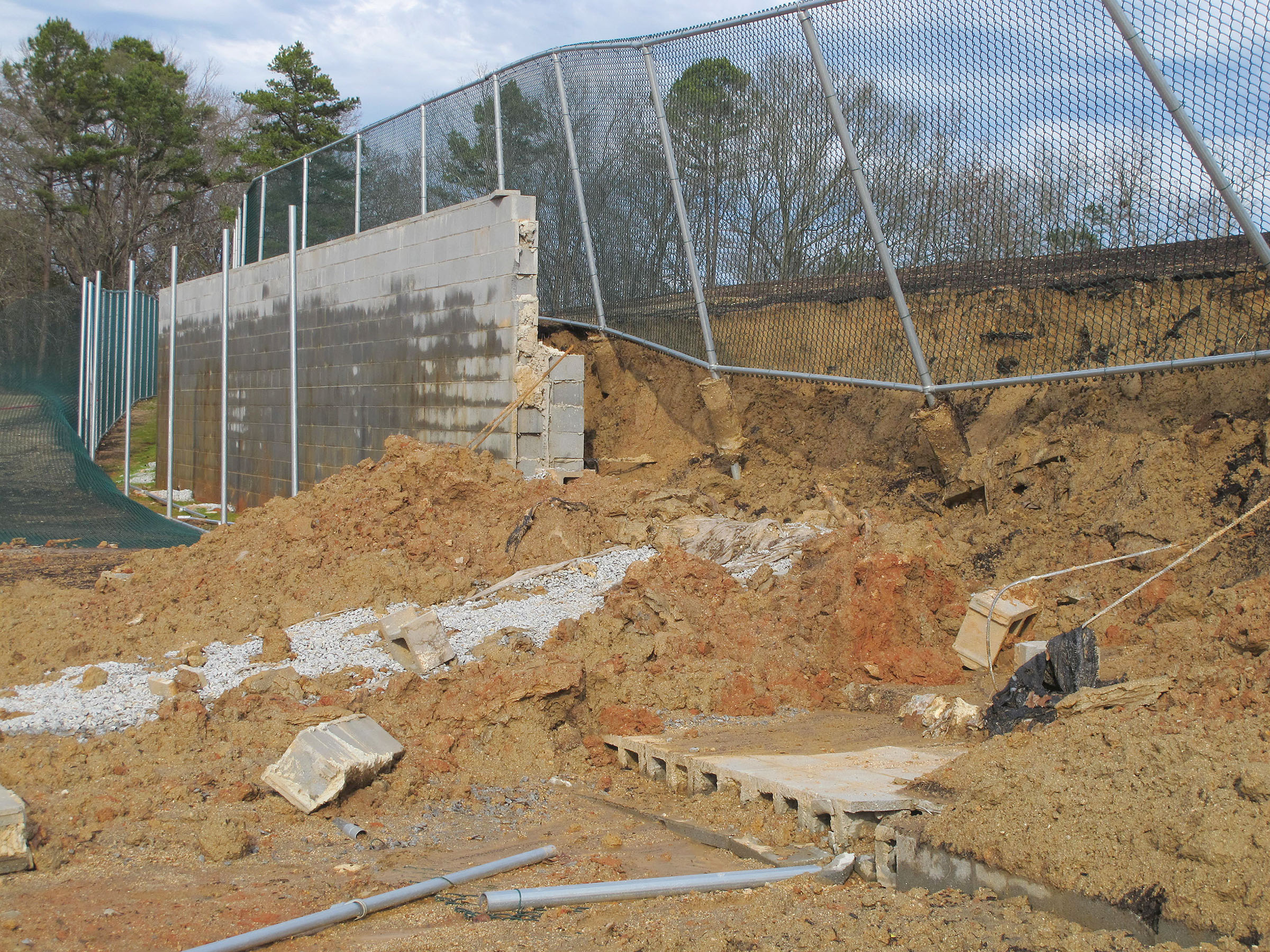 WINNSBORO – In a massive stroke of dramatic irony Sunday night, the suspicions of County Council critics were confirmed when a portion of what is known in some circles as The Great Wall of Fairfield came crashing to the ground, leaving a 50-foot gap in the 525-foot long, 12-foot high retaining wall around the recently completed football field at Drawdy Park. The collapse prompted the appearance of the project’s chief engineer and sparked a public “We told you so” from one Council critic at Monday night’s County Council meeting.