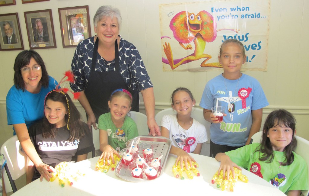 Children’s Director Helen Edwards and Norma Branham, in charge of the kitchen, served eyeball jello and popcorn hands to VBS students Savannah Causey, Makayla Parker and the Branham sisters Bailey, Alexis and Cailyn. (Photo/Barbara Ball)