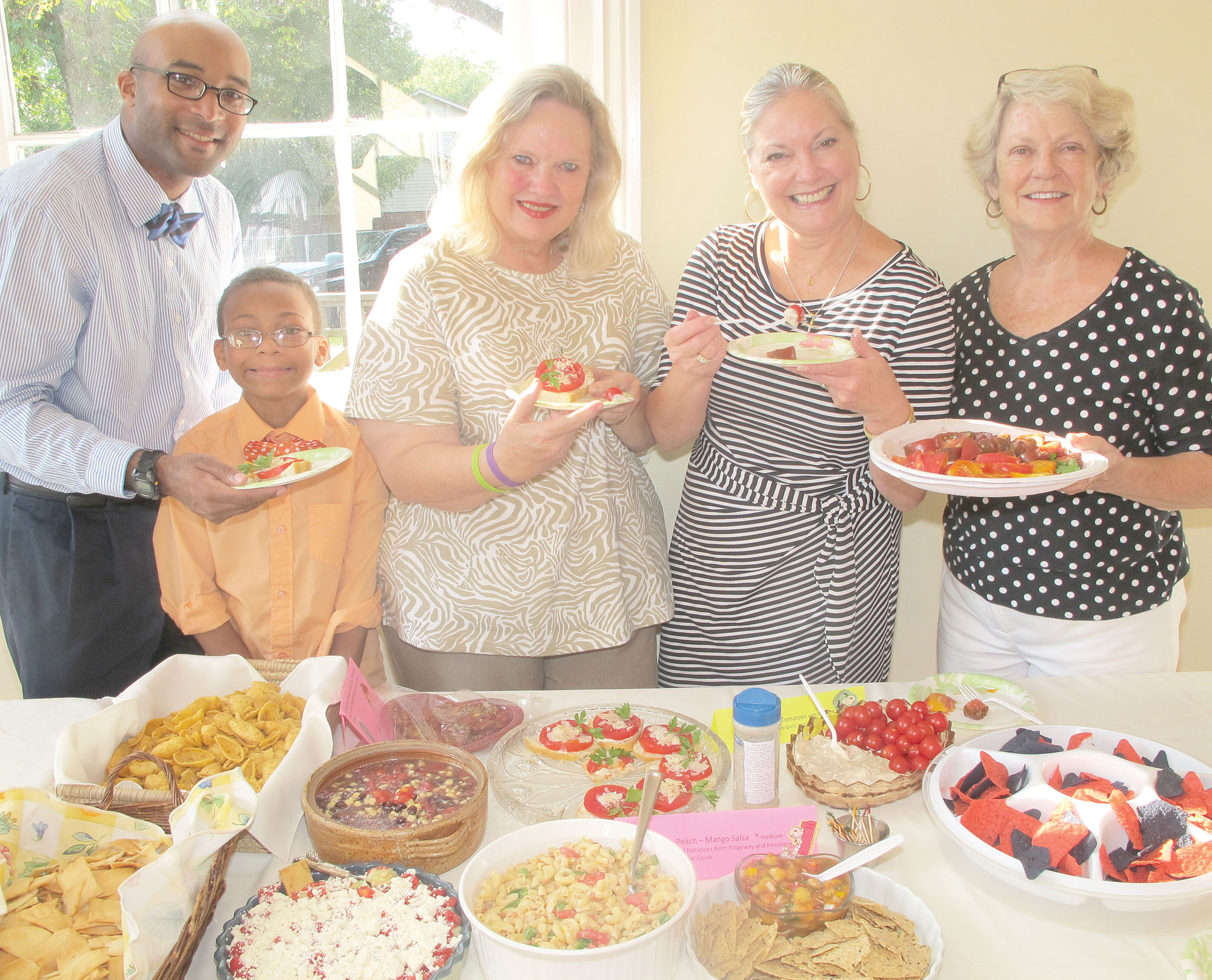 The Fairfield Arts Council’s regular monthly meeting at the Century House in Ridgeway on Tuesday evening was more than just a meeting of the members. Fifty or so guests were treated to a tomato tasting – tomato chips, tomato pie, tomato salsa, tomato sandwiches, tomato casseroles and many more things tomato – followed by a Patsy Cline Evening featuring singer Jean Watkins from Hartsville. Shown here in the tomato buffet line are Marcus Pettaway of Winnsboro and his son, Marcus Jr., 8, whose artwork was on display; singer Jean Watkins; Ridgeway merchant Tina Johnson and Virginia Lacy, president of the FCAC. The next FCAC meeting is scheduled for Sept. 9 at the Century House.