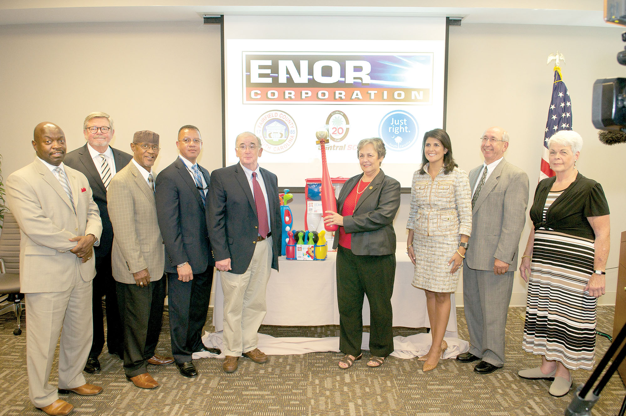 S.C. Gov. Nikki Haley (third from right) and Bobby Hitt (second from left), S.C. Secretary of Commerce, stand with Interim Fairfield County Administrator Milton Pope (far left) and County Council members Kamau Marcharia, Dwayne Perry, David Brown, Carolyn Robinson, Chairman David Ferguson and Mary Lynn Kinley before a sampling of products to be manufactured in Winnsboro by Enor Corp. The company announced the relocation of its production facility last week.