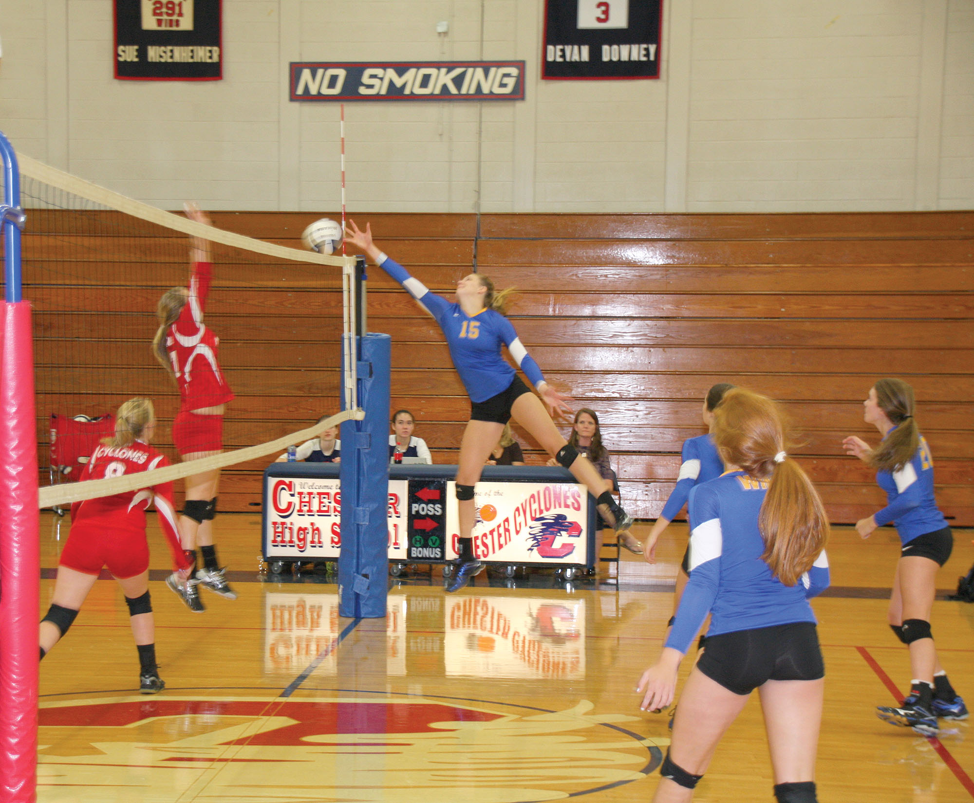 RWA junior Jaycie Johnson (15) stretches out to make the play at the net against Chester Tuesday. (Photo/Martha Ladd)