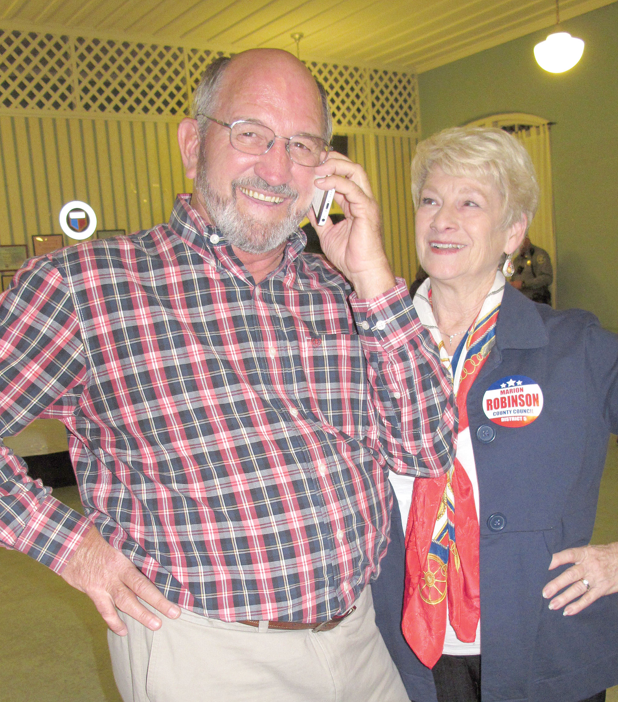 District 5 Councilman Elect Marion Robinson (left) gets the call with the results Tuesday night as his wife Vickie listens in. (Photo/Barbara Ball)