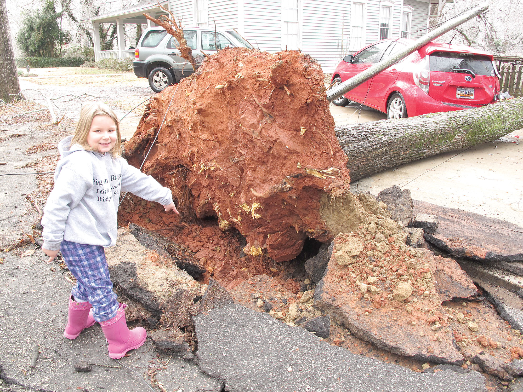 While most of Blythewood and Fairfield County woke up to a beautiful winter wonderland of ice-coated trees and fences Tuesday morning, Taylor Harrison of Ridgeway awoke to find a large iced tree had fallen on the rear of her red 2013 Prius and had taken with it a telephone pole that landed on the top of the car. Harrison’s younger sister, Rosalee, 8, is shown here dramatically describing her reaction to the devastation caused in the family’s yard by the ice storm. (Photo/Barbara Ball)