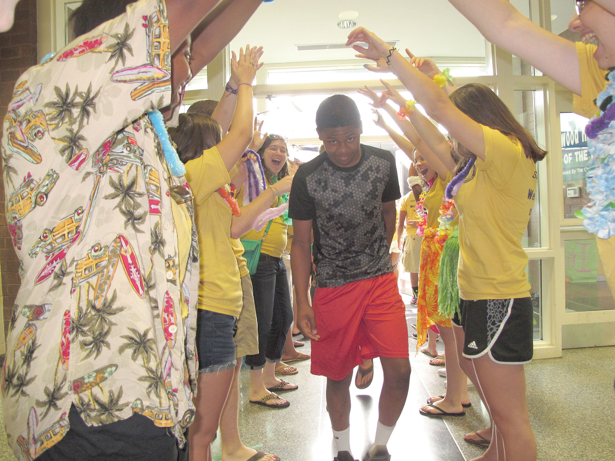Once past the Tiger, freshman Russell Bratton is welcomed inside the building by another line of enthusiastic upperclassmen at Blythewood High School’s first day before the first day of school Tuesday.