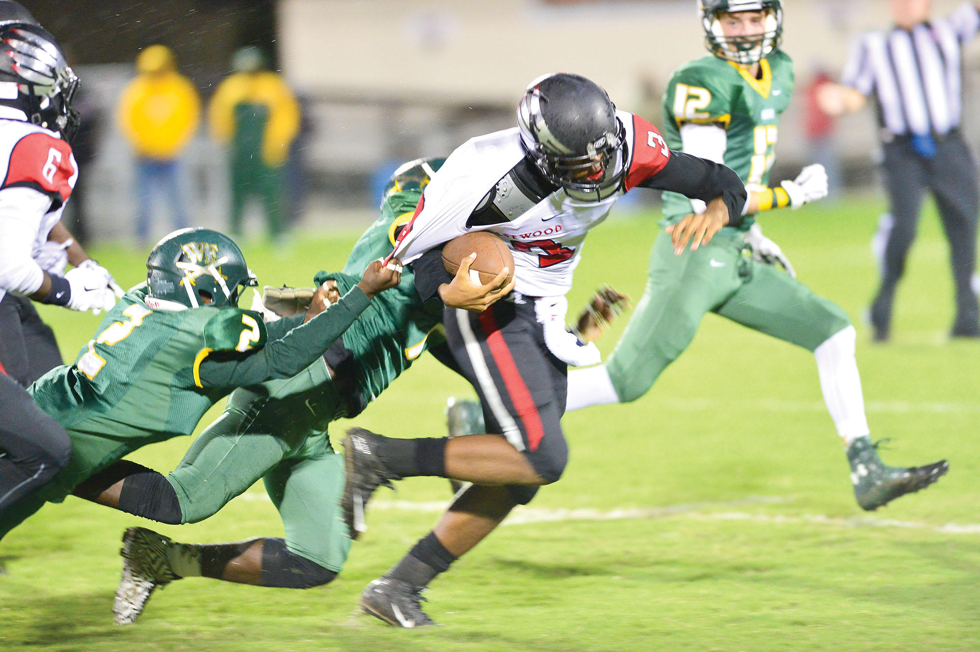 Westwood quarterback Jalen Smith (3) drags a pair of Knights down field. (Photo/Ross Burton)