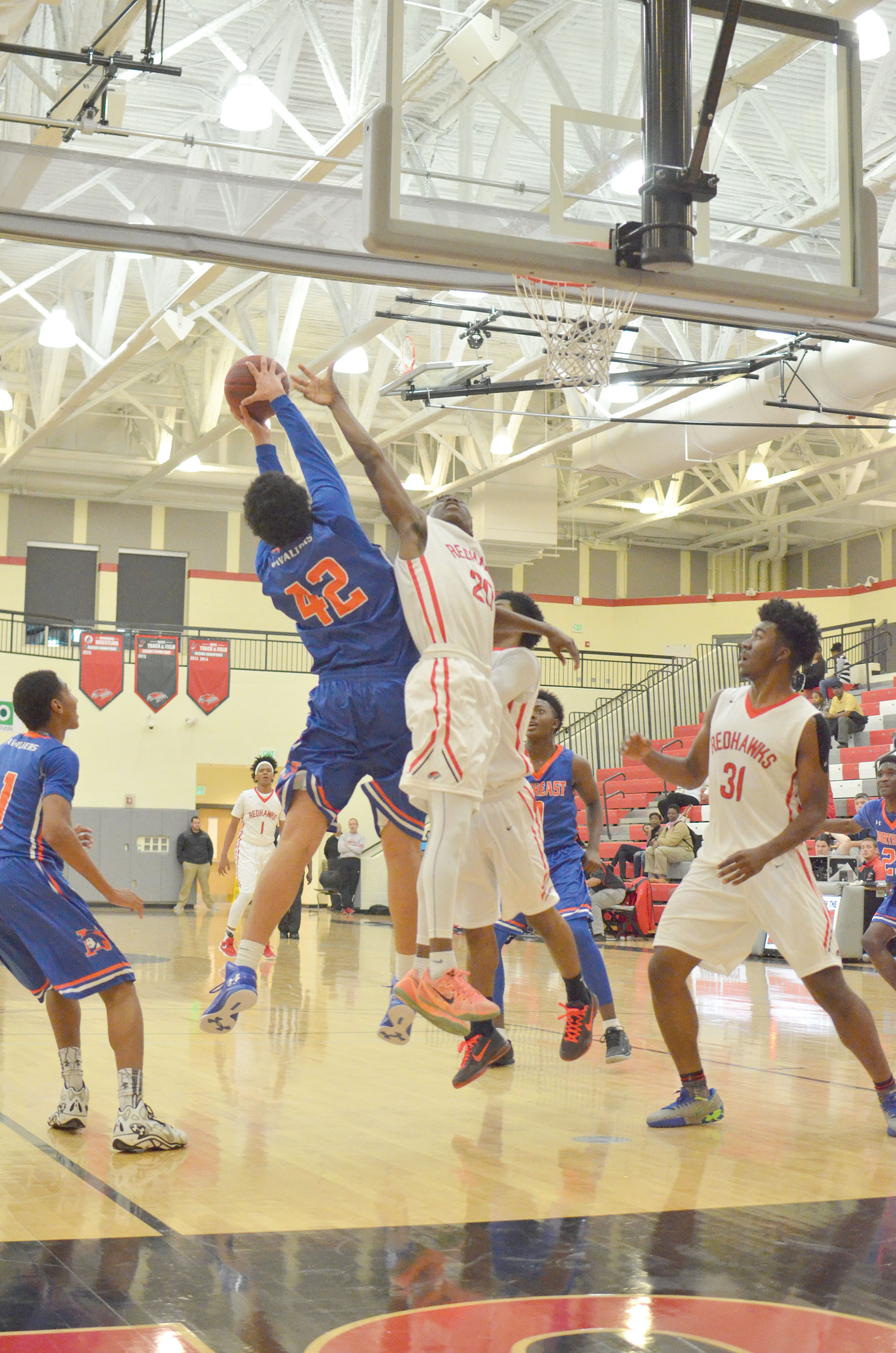 RNE: James Fuller-Davis 14, Andre Garner 11, Chaney 9, Caldwell 8, Brockington 6, Cheeseboro 4, Paulk 2. WHS: Jalen Robinson 10, Jason Frederick 10, Todd Corley 10, James 9, Douglas 5, Davis 5, Barnes 7.