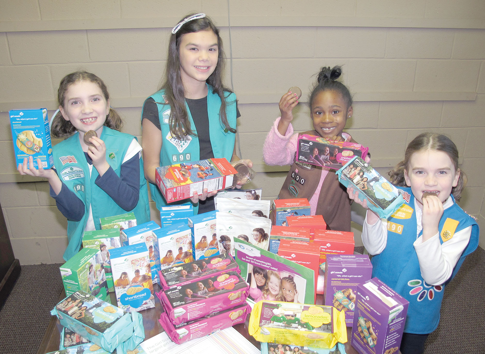 It’s Girl Scout Cookie time and the girls will soon be knocking on your door peddling Lemonades, Cranberry Citrus Crisps, Caramel deLites, Thin Mints, a new gluten-free cookie and more. Four of the varieties are vegan. Taste testing before setting out on their own cookie sales missions are these Blythewood Scouts: Sydney Sutherland (Junior), Asia Freitag (Junior) Malaya Dewey (Brownie) and Megan Sutherland (Daisy). All cookies are $4 a box except the gluten-free, which are $5. Download the official cookie finder app or visit girlscoutcookies.org for more cookie information.