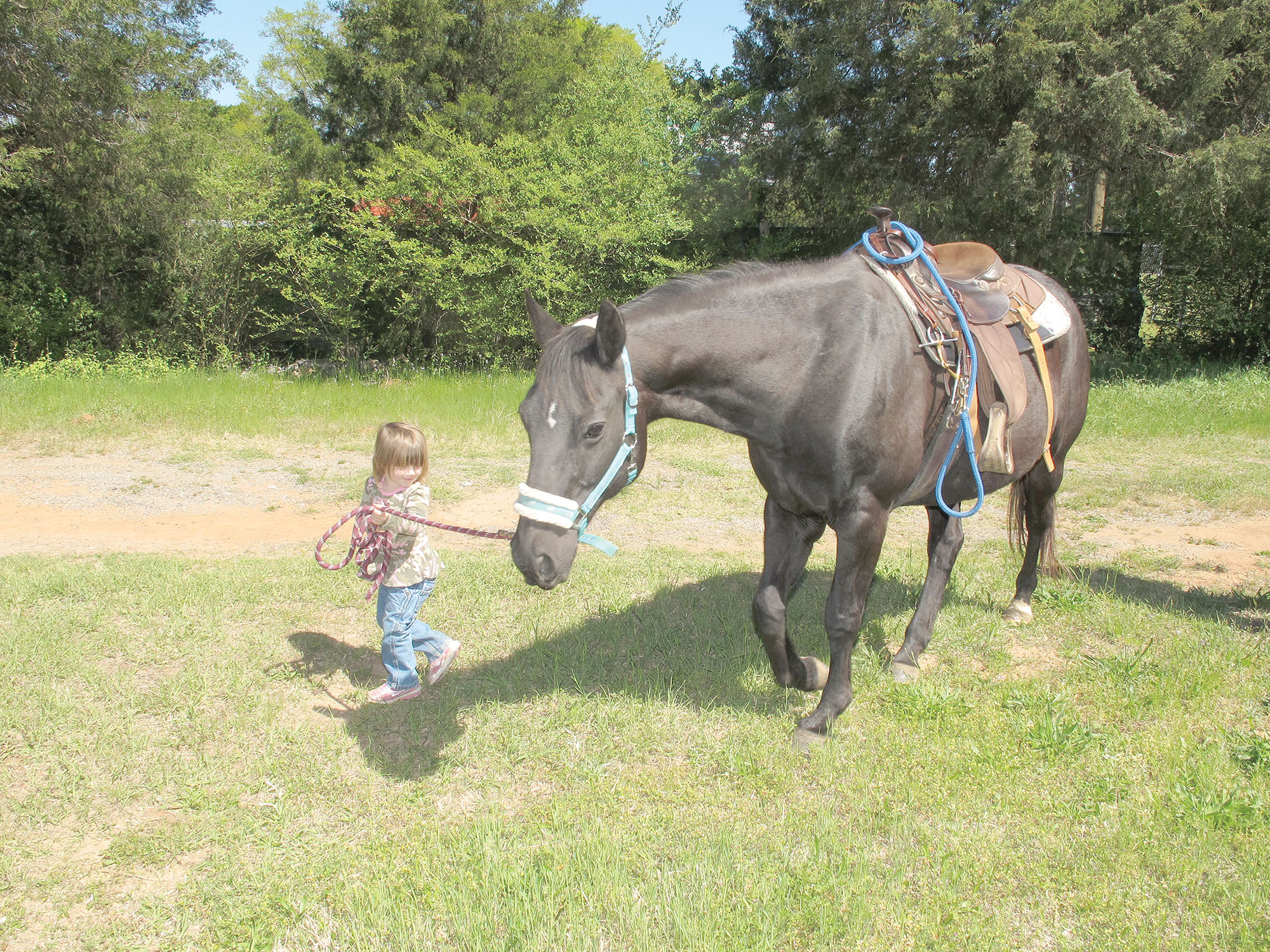 Haven Jones, 3, takes charge of her steed, Midnight, following a ribbon cutting for Southside Ranch & Tack, a Winnsboro shop recently opened by her grandmother, Lori Jones, to fund Jones’ animal rescue organization.