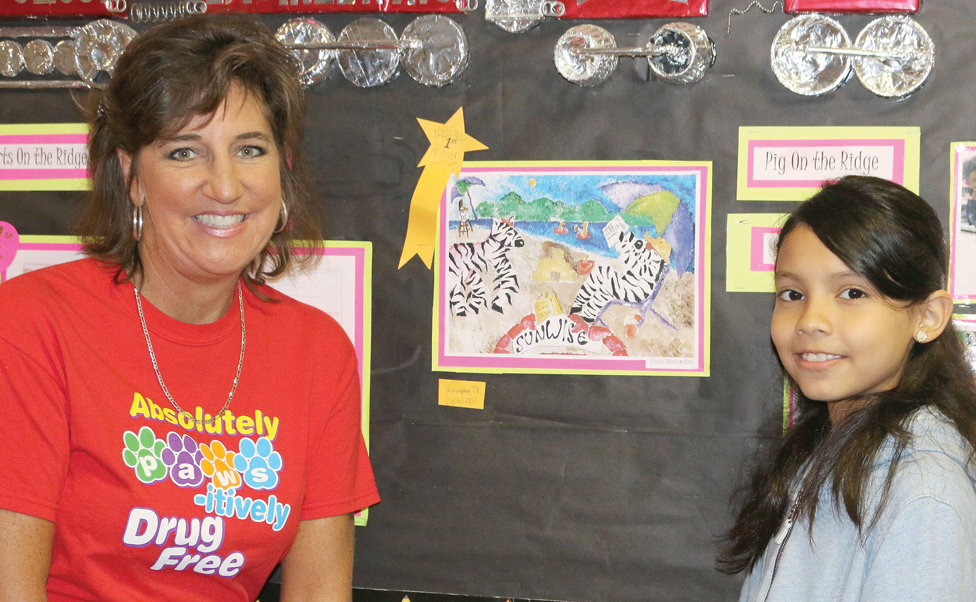 Alexia Hernandez (right), a fourth-grade student at the Fairfield Magnet School, and her art teacher, Kimi Daly, pose with Hernandez’s winning work in the National SHADE Foundation Poster contest. Hernandez’s portrayal of the harmful effects of too much sun earned her a trip to Washington, D.C.