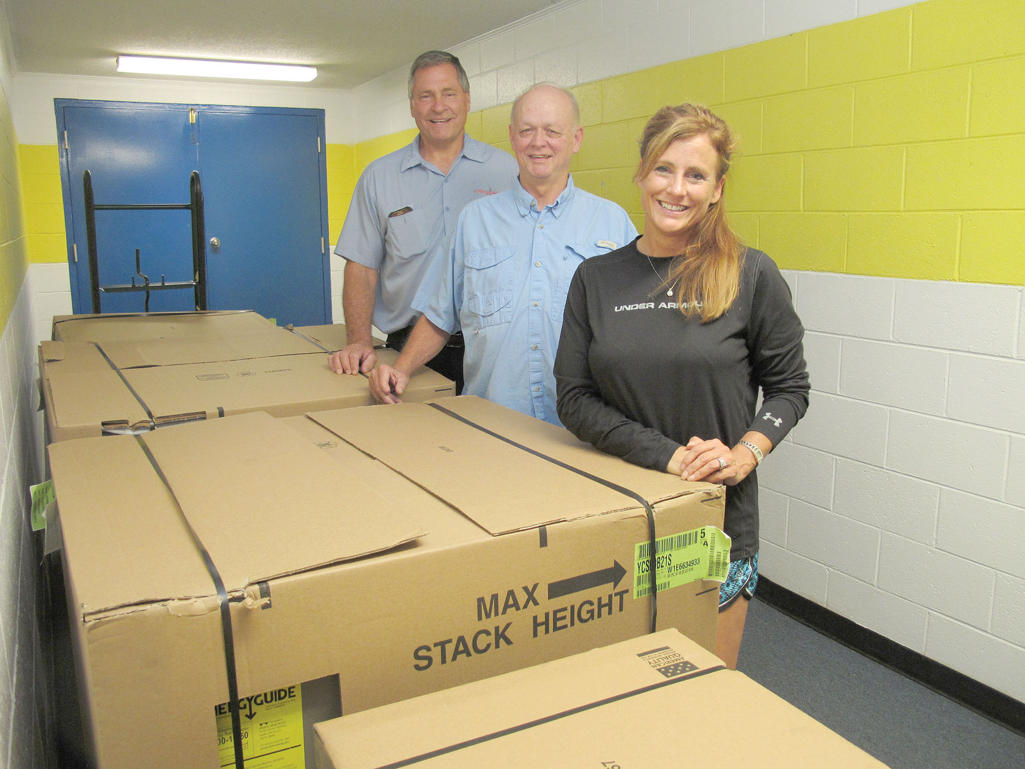 Richard Winn Academy Head of School Brandy Mullennax accepts a donation of two 5-ton split system air conditioning replacement units from Jimmy Ray Douglas, center. Johnny Porter arranged and paid for installation of the units. RWA is sprucing up for the 2016-2017 school year.