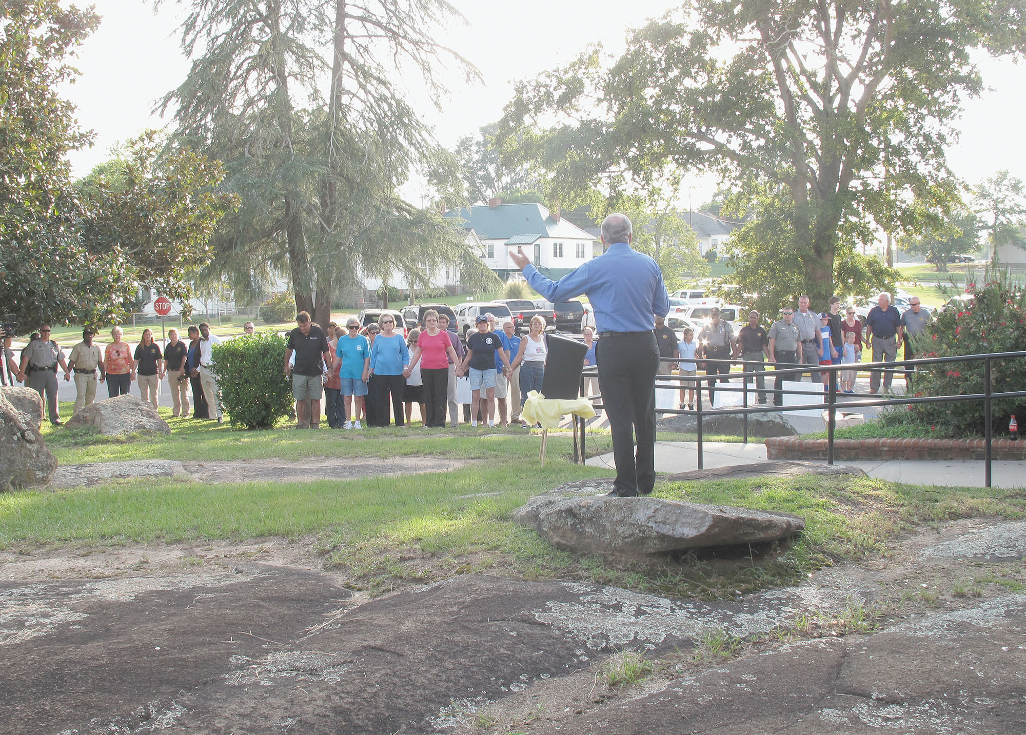The Rev. Craig Bailey, Pastor of Winnsboro’s First Baptist Church, addresses the crowd gathered outside the Fairfield County Sheriff’s Office Tuesday evening to participate in a ‘Wall of Prayer’ to honor and thank the County’s first responders. Sponsored by Rep. MaryGail Douglas and Sen. Creighton Coleman, The Wall was created as those attending joined hands and bowed their heads in prayer.