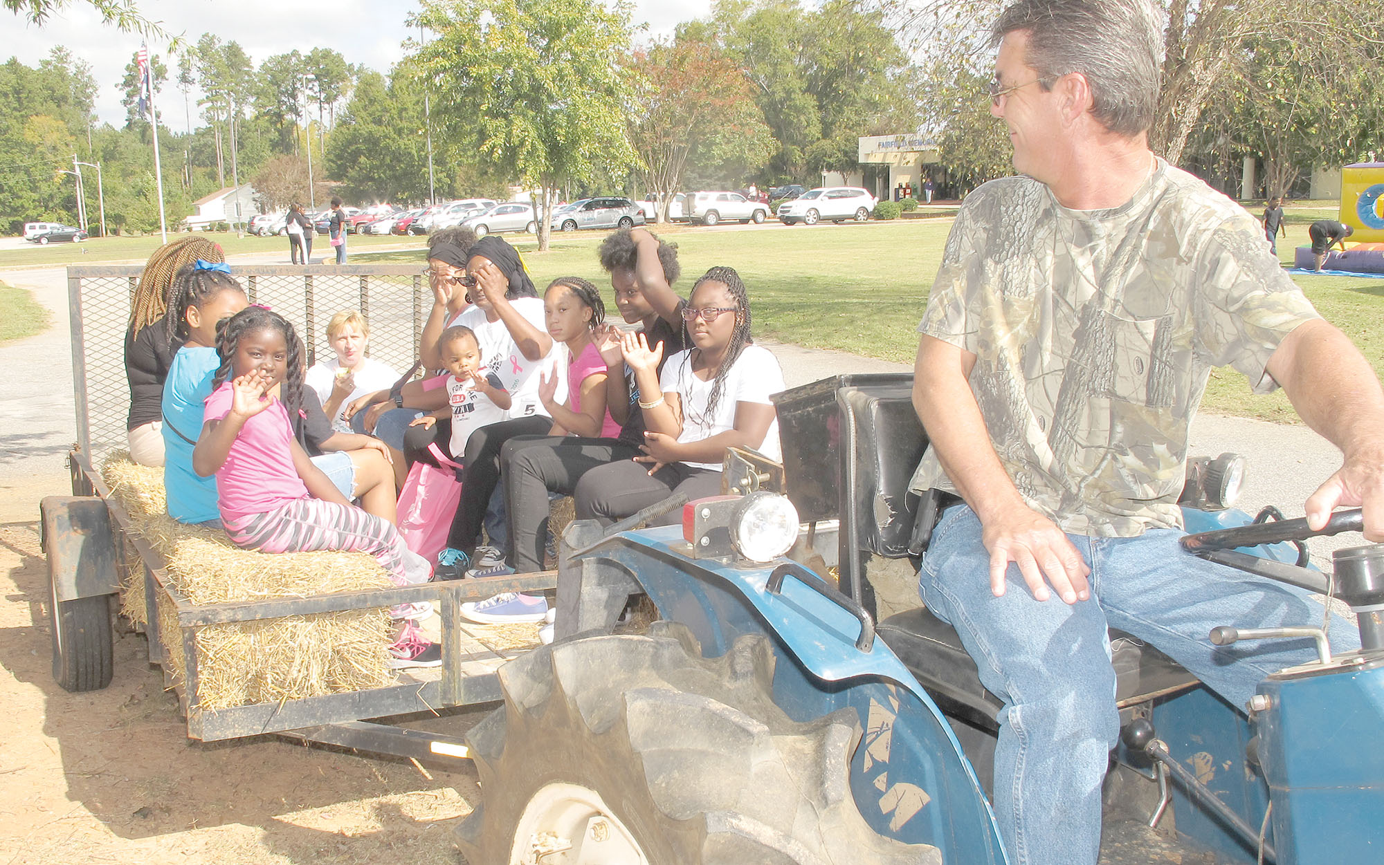 Tractor driver Carl Baughman checks on his passengers before taking them on a spin in his hay wagon around the hospital campus at Fairfield Memorial Hospital’s Healthy Walk.