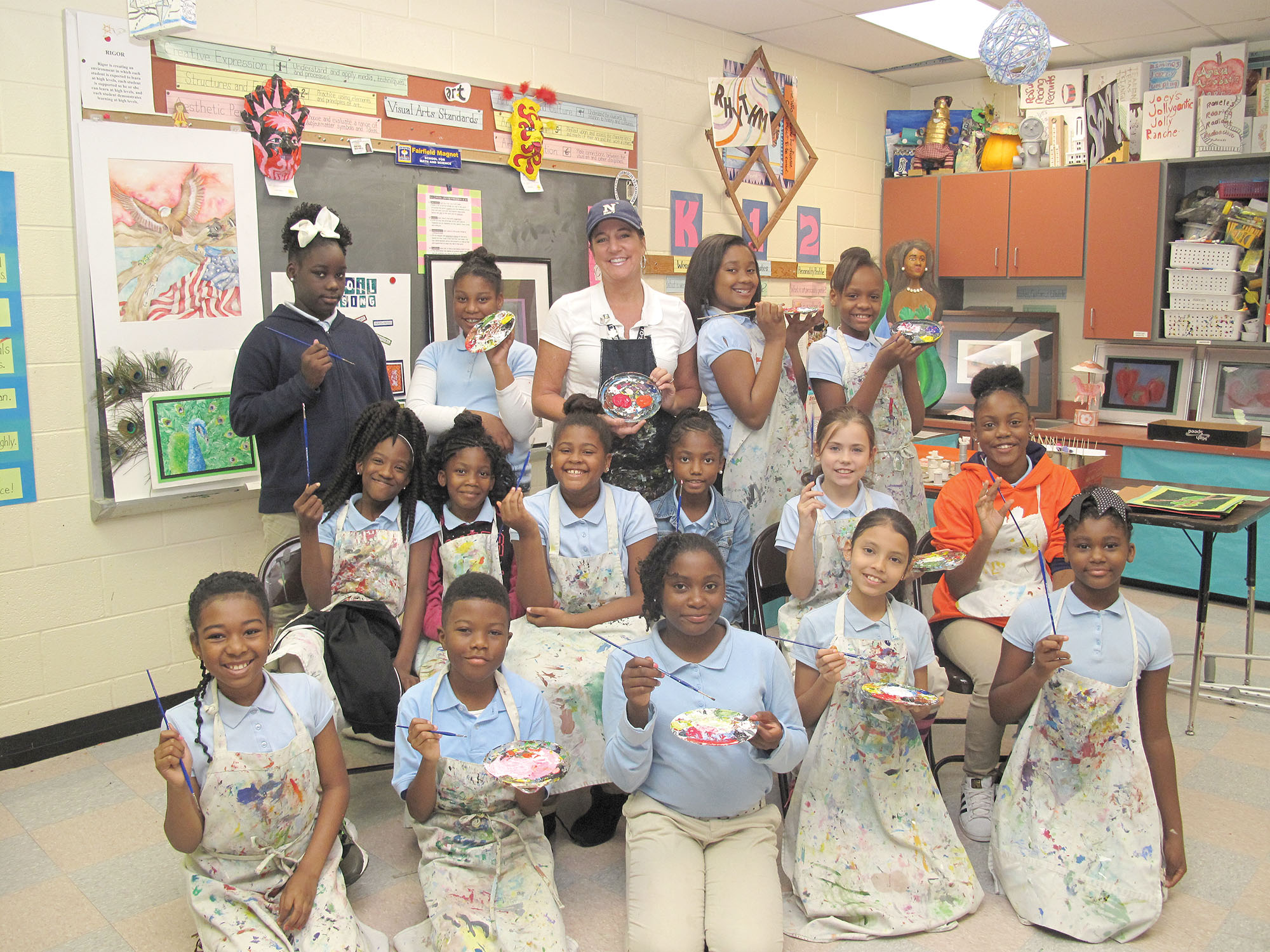 Kimi B. Daly (back row, center), Art teacher at Fairfield Magnet School for Math and Science, and her students: Makayla Mann, Gianna Rhodes, Kimi Daly, Reniya Lyles, Tiauna Turner, Sharmelle Holmes, Caniya Brown, Paige English, Tavetria Amponsah, Layla Metts, Senai Greene, Trinity Skye, Tyus Armstrong, Skyla Hart, Alexia Hernandez and Jazzalyn McConnell. The Magnet School recently received the highest scores in the state in both Art and Music. (Photo/Stephanie Boswell)