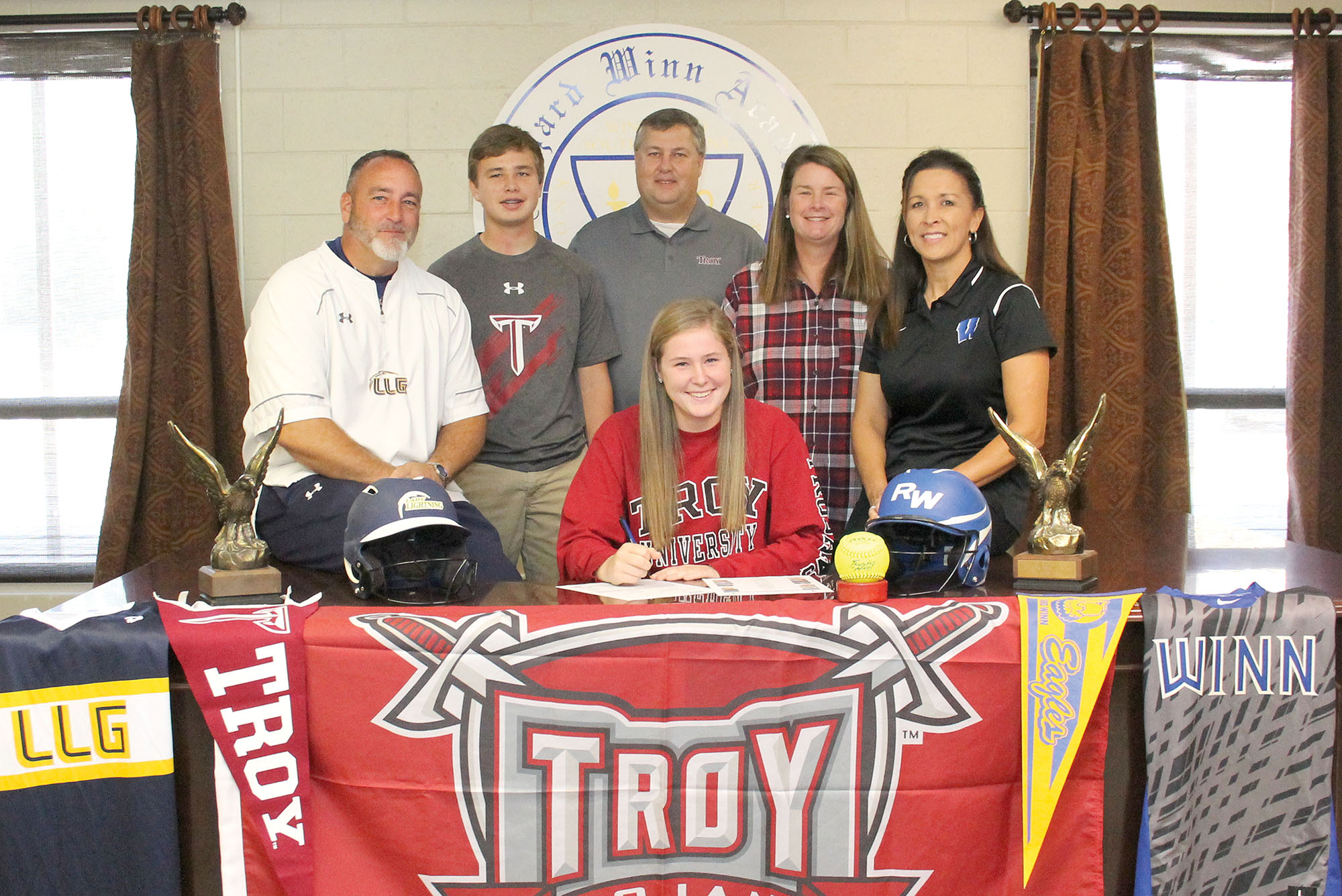 Bailey Taylor, a senior at Richard Winn Academy, signed on Monday to play softball in the Sunbelt Conference at Troy University in Troy, Ala. Joining Bailey are her travel ball coach, John Corn; brother Zack, parents Rod and Retta, and RWA softball coach Millie Lambert.