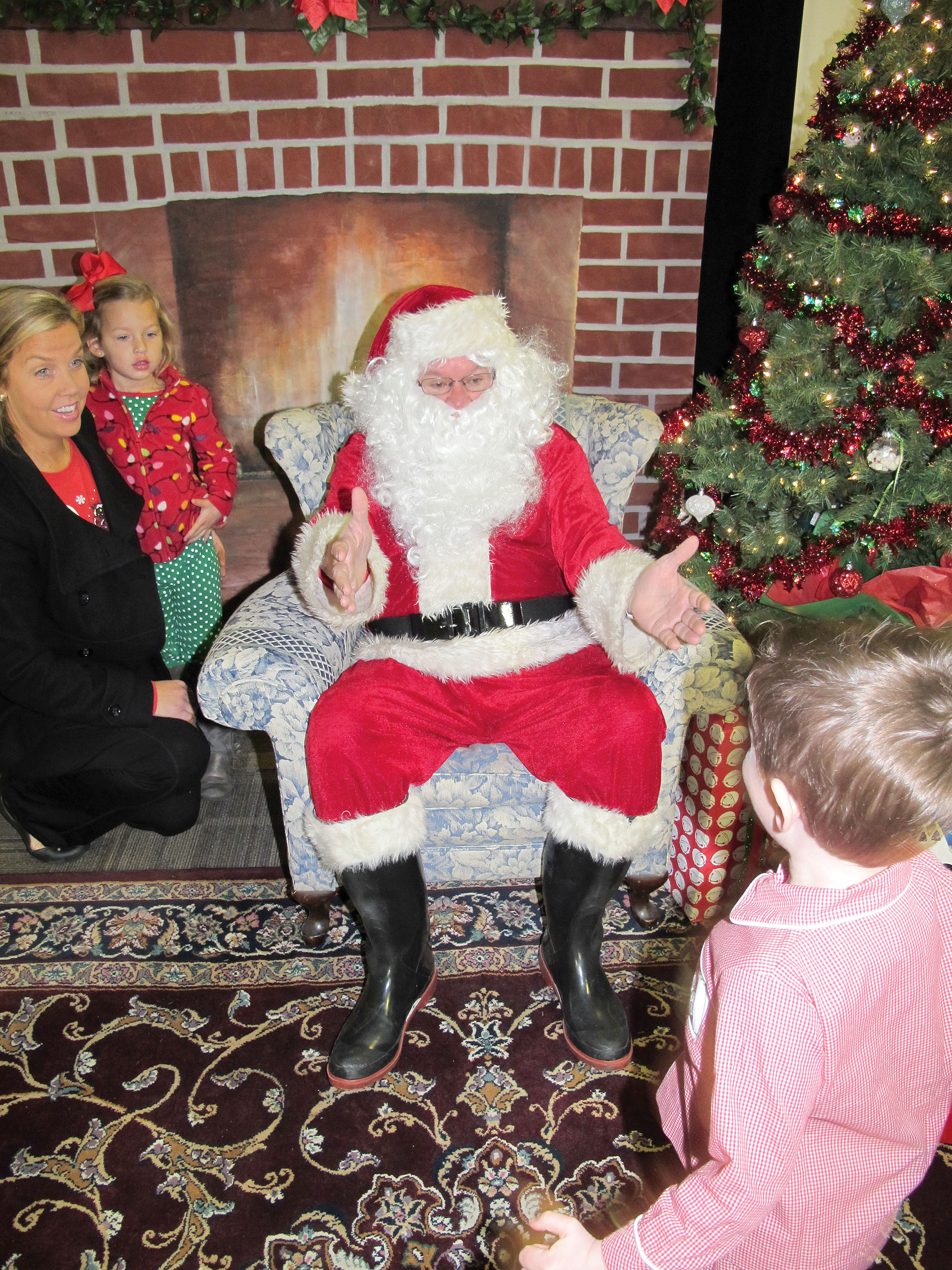 Mayes McDaniel, 3, heads for a welcoming Santa while his sister, Taylor Kate, 4, waits her turn next to her mom. The chats with Santa followed a breakfast of pancakes and orange juice during the Blythewood Lions’ Club Breakfast with Santa held at Trinity UMC’s Family Life Building.
