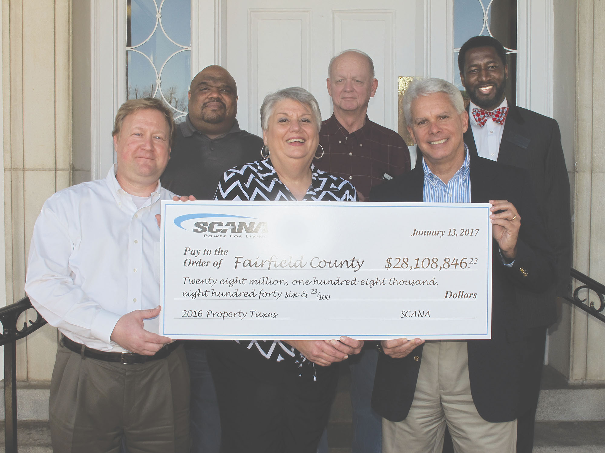George Lippard, Vice President of Nuclear Plant Operations at V.C. Summer Unit 1, right, presents Fairfield County Treasurer Norma Branham with the plant’s annual property tax contribution – $28,108,846.23. At left is Fairfield County Administrator Jason Taylor. Back row: Deputy County Administrator Davis Anderson, County Councilman Jimmy Ray Douglas and Fairfield County School Superintendent Dr. J.R. Green.