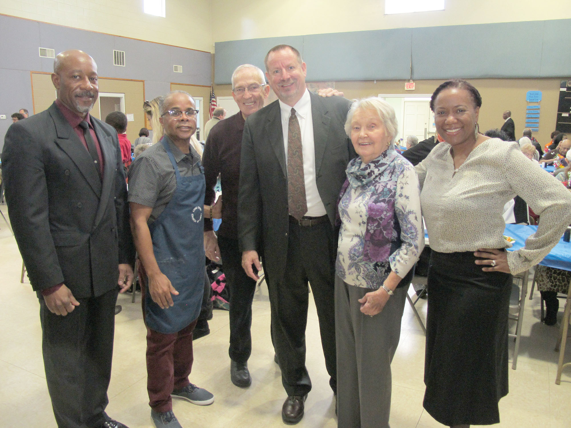 Bidding farewell to the church’s pulpit minister, David Hamilton, center, are from left: Dan King (family life minister), Dr. Gary Bell, (deacon, who doubles as the church’s chef), member Leon Philpot, Hamilton, member Jane Farley (whose late husband, Jim, built the church building) and member Valissia Palmer. (Photo/Barbara Ball)