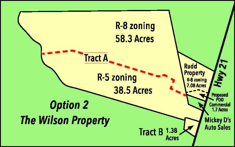 Planning Commission from developer D. R. Horton to rezone approximately 98 acres on two tracts of land located on Wilson Boulevard between Oakhurst Road and Highway 21 to accommodate the lot sizes that Council had voted a week earlier to banish. That property is currently zoned Development (D-1) with a minimum lot size of 20,000 square feet.