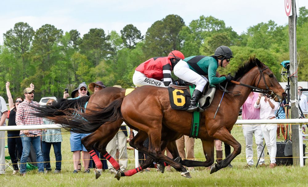 After making her debut as a steeplechase jockey at the Aiken Spring Steeplechase two weeks ago, where she took second place in her first race, and riding two races during the Carolina Cup in Camden last week, Emma Clifton of Blythewood brought home her first win at the Steeplechase of Charleston at Stono Ferry on Saturday. The win was also a first for Clifton’s mount, Petak Mountain, an 8-year-old owned by In Memory of My Father Stable and trained by Archibald Kingsley, Jr. of Camden. In the photo above, Clifton pulls ahead of jockey Richard Boucher on the 1-1/4 mile turf track to take the win. Read more about Clifton in the Spring issue of Rider’s Up! magazine, a quarterly publication of The Voice that features stories about horses and riders in Blythewood and Fairfield County. Clifton’s husband, Brice, is the assistant baseball coach at Blythewood High School.