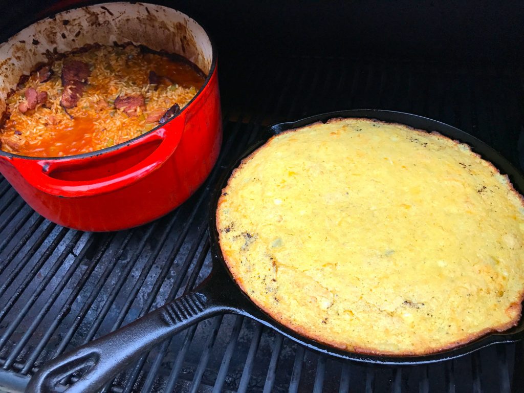While not traditional grill food, Jambalaya and Jalapeno Cornbread are divine on a pellet grill