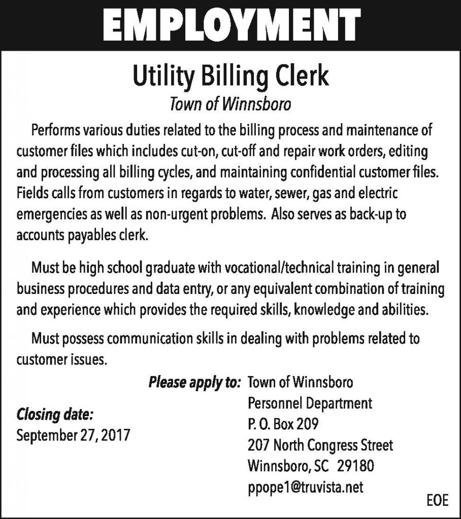 Employment: Utility Billing Clerk, Town of Winnsboro