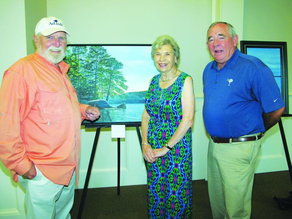 Blythewood Artist Harold Branham visits with Jeanette Smith and Johnny Bloodworth during an art reception Tuesday evening at Doko Manor featuring a series of 12 of Branham’s paintings titled ‘A Year on the River.’