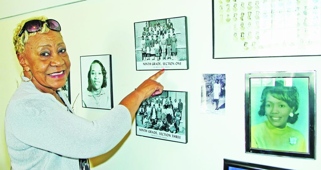 Gladys Allen, class of ‘64, shows the photo of her ninth grade class with a wall of memorabilia in a renovated classroom.