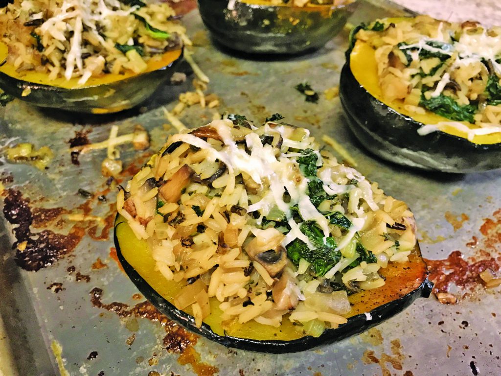 Add the kale and sauté until wilted and softened. Stir in the cooked rice mix, taste and adjust seasoning. Divide the filling evenly among the hot squash halves. Return the squash to the oven to 10-15 minutes.