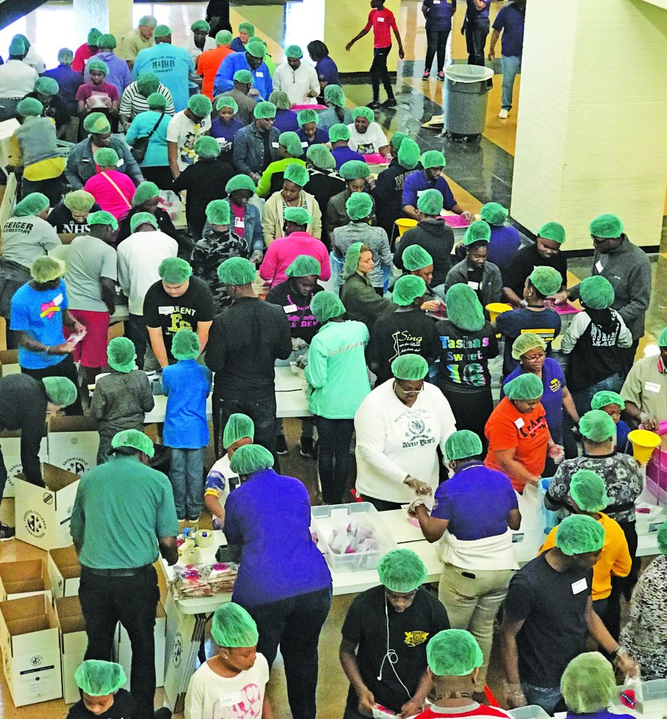 WINNSBORO -St John Baptist Church partnered with Feeding Children Everywhere in coordination with financial support from an array of individuals, churches, organizations and local businesses for a very successful Hunger Project today at Fairfield Central High School in Winnsboro, South Carolina.  Over 150 volunteers packaged more than 25,000 meals for Fairfield County food pantries and organizations in a little over one hour. This healthy meal, a lentil casserole, consists of rice, lentils, over 60 dehydrated vegetables and Himalayan salt.  This year marks the church’s 145th anniversary. The church’s theme, Greater Service to God through Greater Service to Mankind, was exemplified.