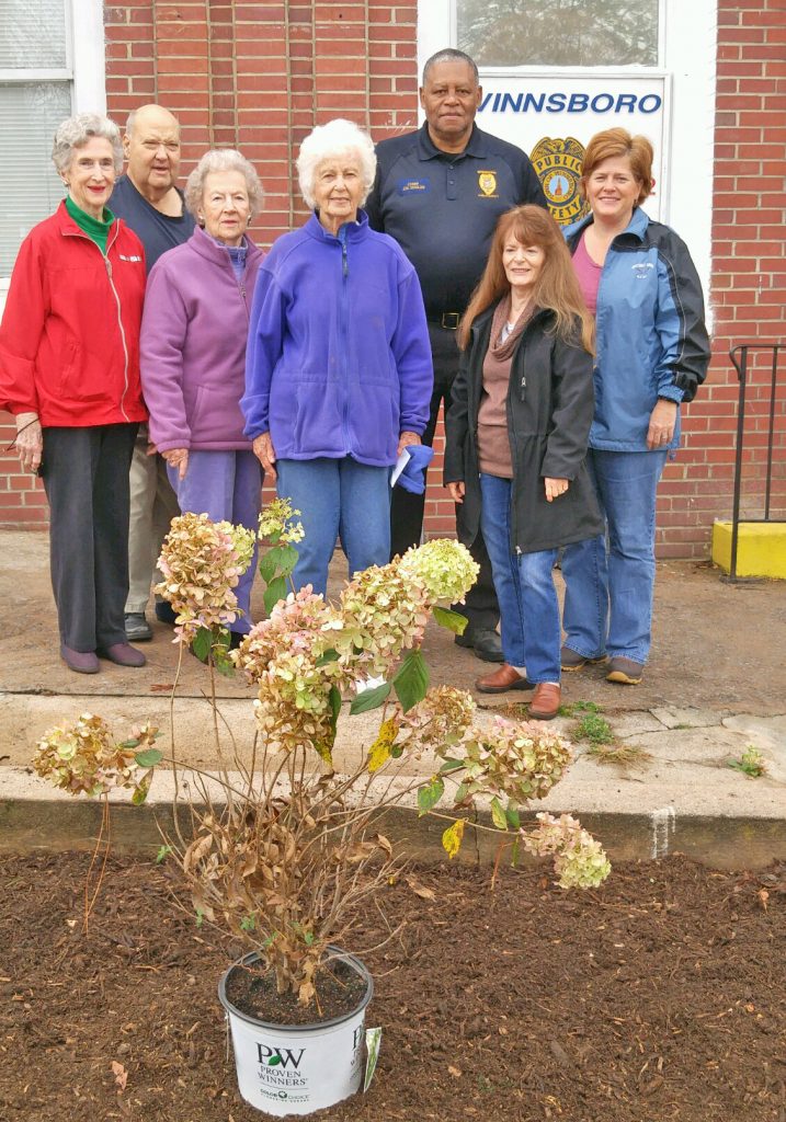 The Anemone Garden Club planted lime light hydrangeas in front of the Winnsboro Police and Fire station. Pictured at the planting are Ivor Stephenson, Danny Evans, Hannah Phillips, Betty Harden, Chief of Police John Seibles, Pat Curlee and Michelle Taylor. Marcus Johnson and Kitty Rabb also participated in the project.