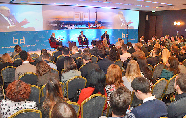 SERBIA – Dr. Charles Kegley of Cobblestone Park in Blythewood, center, shared the stage last month with the President/Prime Minister of Serbia, Aleksandar Vucic, and moderator Dragan Simic, a Dean at the University of Belgrade, during an international conference, the Belgrade Strategic Dialogue, in Serbia.