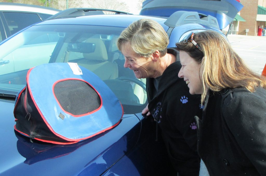 Cam Chappell, left, and Cilla Phillips, two Blythewood women who help manage cat communities, say good-bye to Lux before his ride back to Jacksonville. | Photos/Barbara Ball
