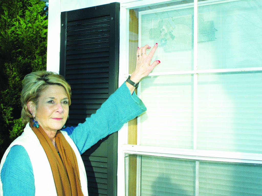 Rimer Pond Road resident Gina Lee points to a bullet hole left in her family’s breakfast room window during the afternoon of Jan. 19. So far there are no suspects. | Barbara ball
