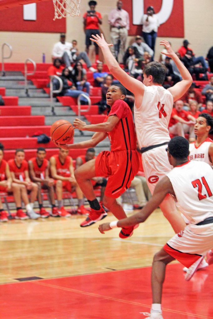 Zachary Dunlap (4) contorts himself through the lane for a look at the rim. | Leroy Howard