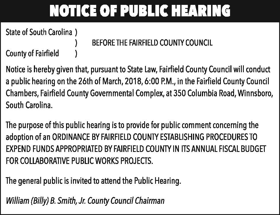 Notice of Public Hearing: Fairfield County Council, Public Works Projects