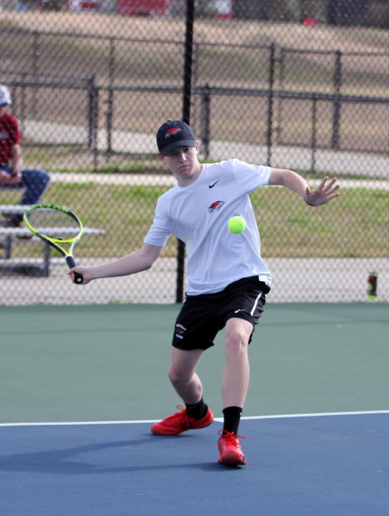 BLYTHEWOOD – Steven Massey sets hit feet and prepares to launch a return shot. Massey lost in a tough three set matchup to York’s Blake Williams. The Cougars swept the Redhawks 6-0, and also bested them in doubles competition.