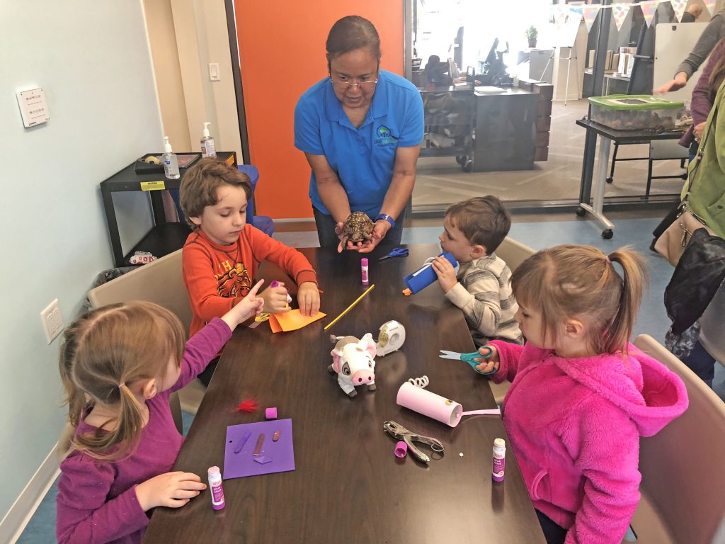 BLYTHEWOOD – Rosemary Martin-Jones of Camp Discovery introduced a wriggly turtle for petting during Blythewood Library’s event last Thursday as Harper Robinson, 3, (left) Levi Moore, 5, Kyle Schwarzbauer, 3, and Avery Robinson, 4, create their own colorful animals with paper, glue, pipe cleaners, and other supplies.