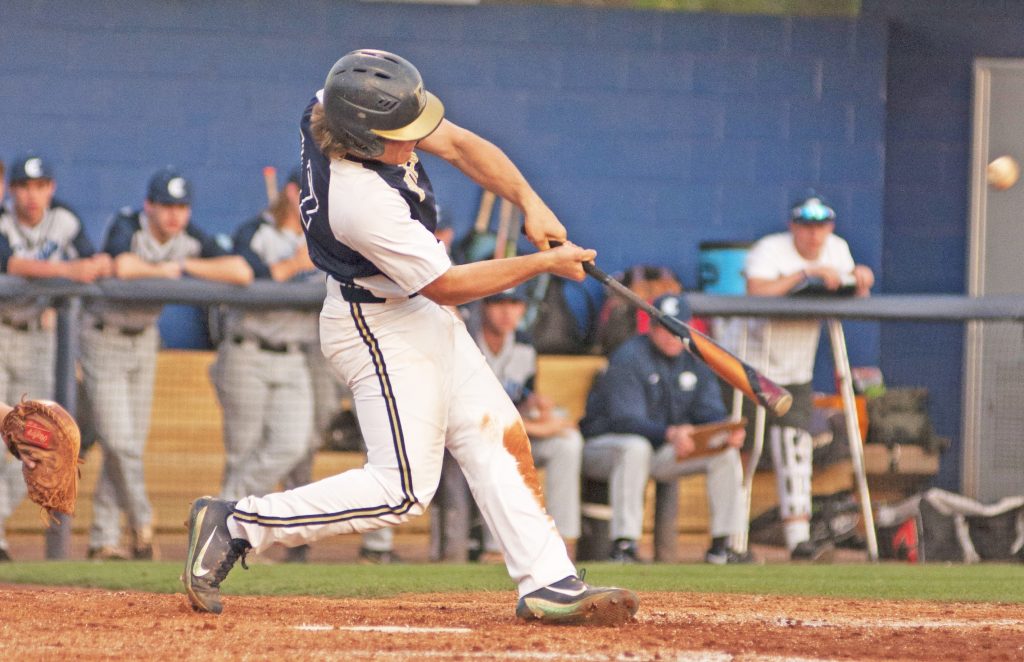 The ball bounces off the powerful bat of Brady Carson. | DeAnna Robinson
