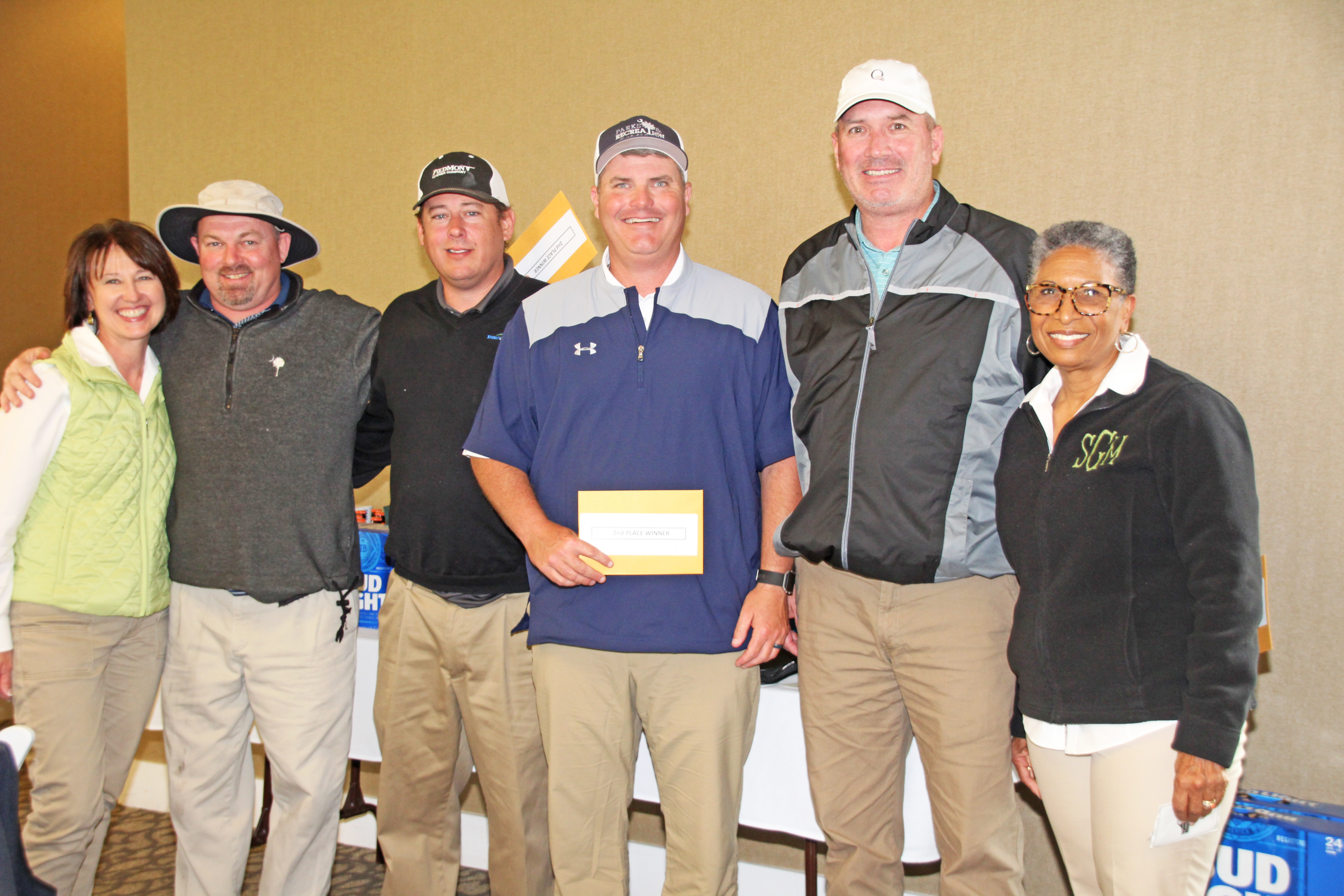 BLYTHEWOOD – The Fairfield County Board of Disabilities and Special Needs held their ninth annual golf tournament Monday, April 16 at Cobblestone Park. Members of the first place team, above with DSN Director Laura Collins, are, from left, Chris Knight, Jody Bartell, Demetrius Cassellas, and Taylor Ingle (not pictured). Pictured below with Collins are second place finishers Crawford Hughes, Cal Caldwell, Russell Price, Jeff Wade, and Shirley Greene.