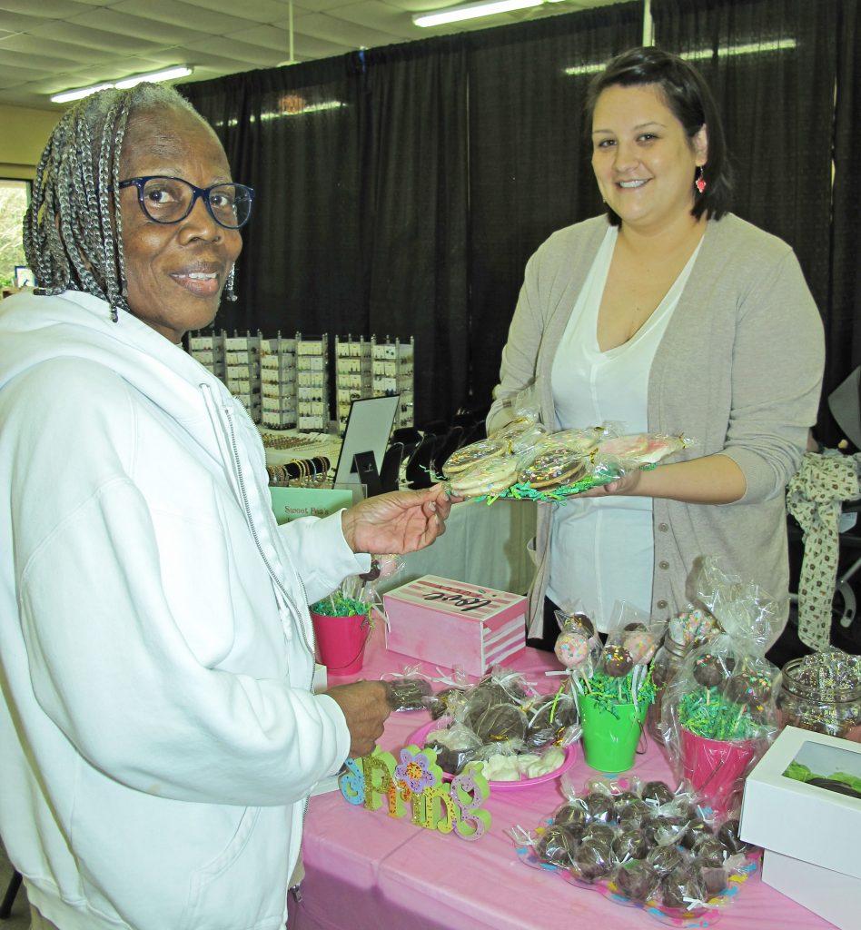 BLYTHEWOOD – Jamie Harkness, right, of Sweet Pea’s Ice Cream Parlor, sells cookies to Joyce Collins at the Blythewood Spring Market.