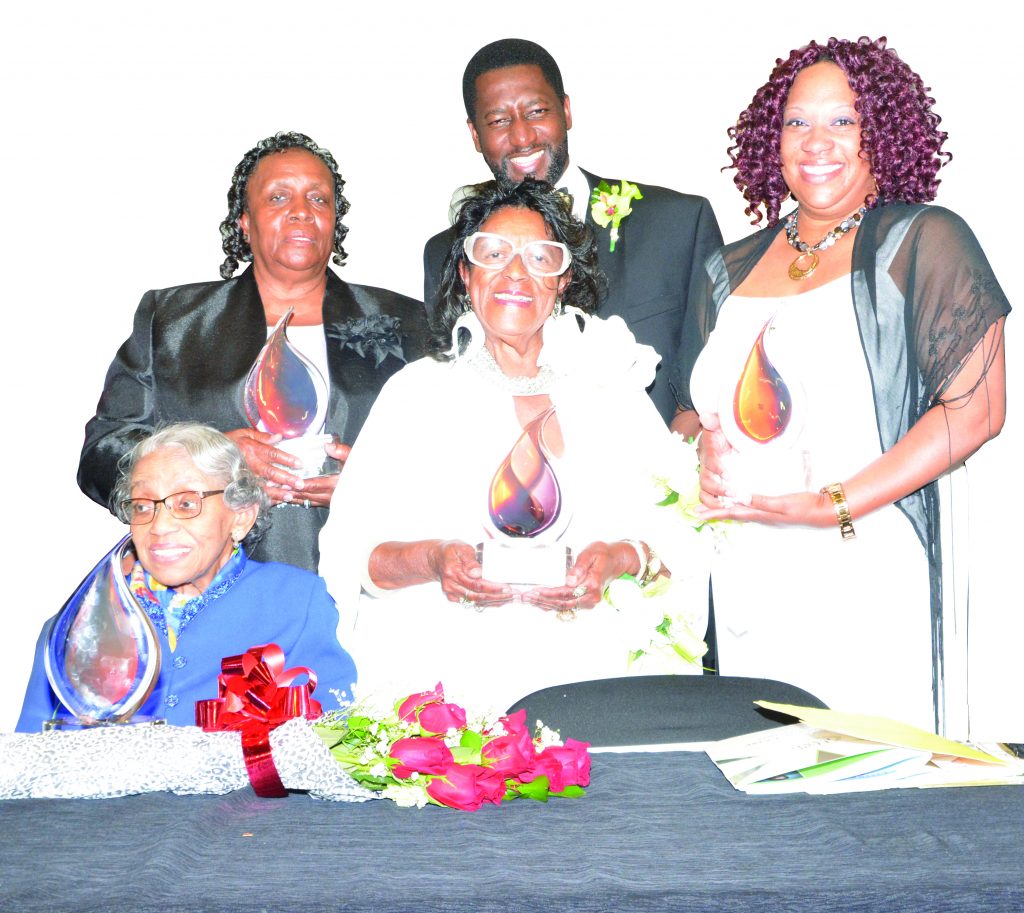 WINNSBORO – Fairfield County School District inducted five into the 2018 Hall of Fame class on Saturday at Fairfield Central. Inductees, pictured from left with Dr. J.R. Green, are Bernice Brown, seated; Inetta Simpson, accepting the posthumous award on behalf of her husband Walter Simpson; Mary Lee Hendrix; Shanna Brice, accepting on behalf of her mother, Jennifer Jenkins, who was unable to attend. Sallie Thompson was also inducted posthumously.