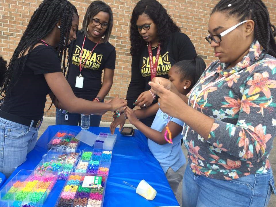FCHS student GeNyya Johnson, FCHS Business Teacher Stephanie Vincent, FCHS Principal Tracie Swilley, and FCHS student Bria Jackson help students create DNA crafts
