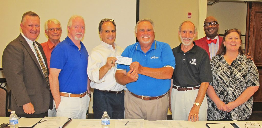 BLYTHEWOOD – Doko Meadows Park Foundation (DMPF) President Paul Moscati, center, presented a check for $40,000 to Mayor J. Michael Ross and council Tuesday evening for fencing for the Palmetto Citizens Amphitheater. Councilman Bryan Franklin, left, DMPF board member Jim McLean, Councilman Eddie Baughman, Moscati, Ross, Councilmen Malcolm Gordge and Larry Griffin and DMPF board member Chris Keefer.