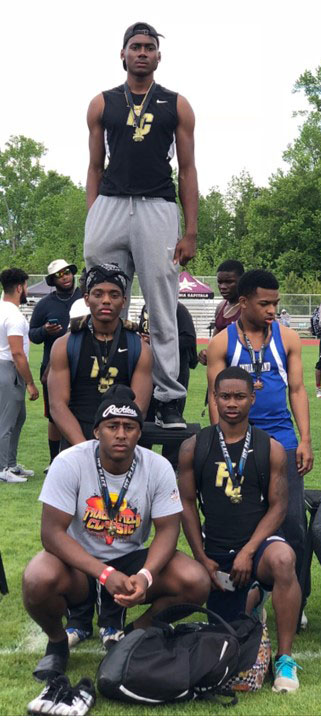 Boys 4×100 relay team from a season meet: Dorian Glenn, bottom left, Ahquil Ross, bottom right, Wesley Benbow, middle, Kimoni Harris, top. Not pictured is Jamas Goins, who replaced an injured Harris in the Upperstate and State meets. | Tomeika Banks