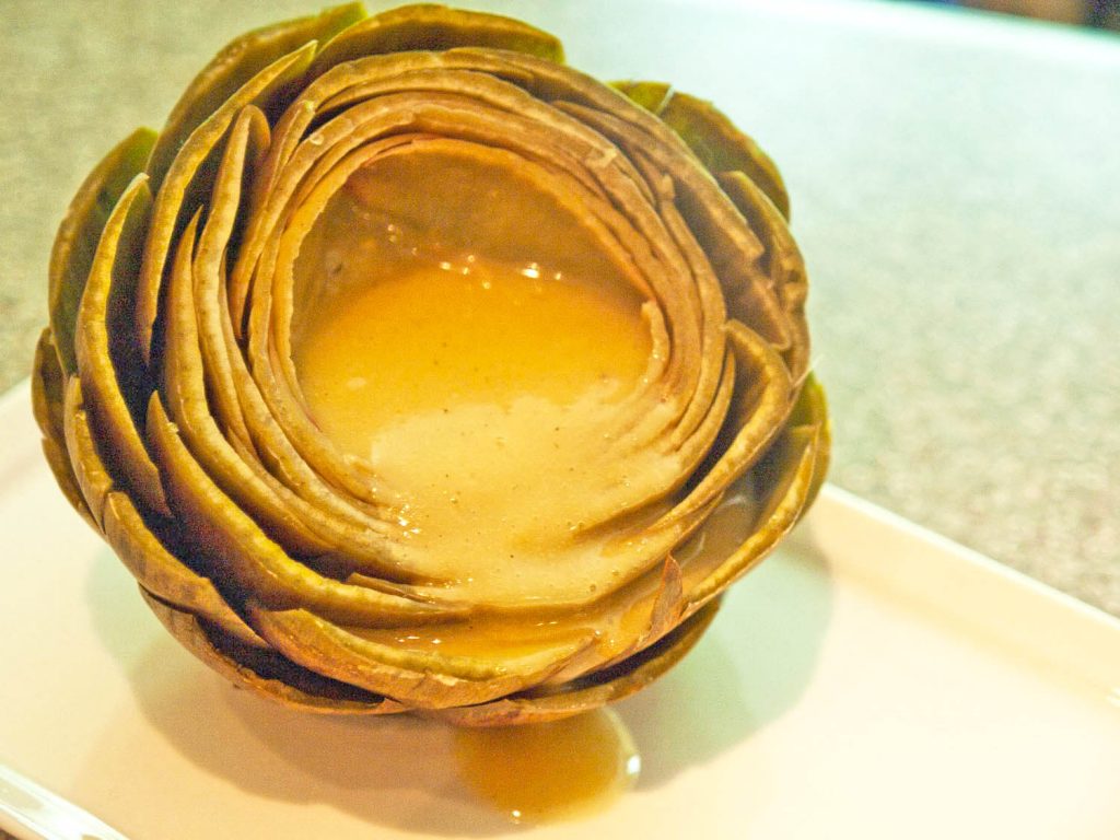 Work your way, leaf by leaf toward the tender, inner leaves and artichoke bottom/heart. Use a knife and fork to enjoy this delightful morsel.